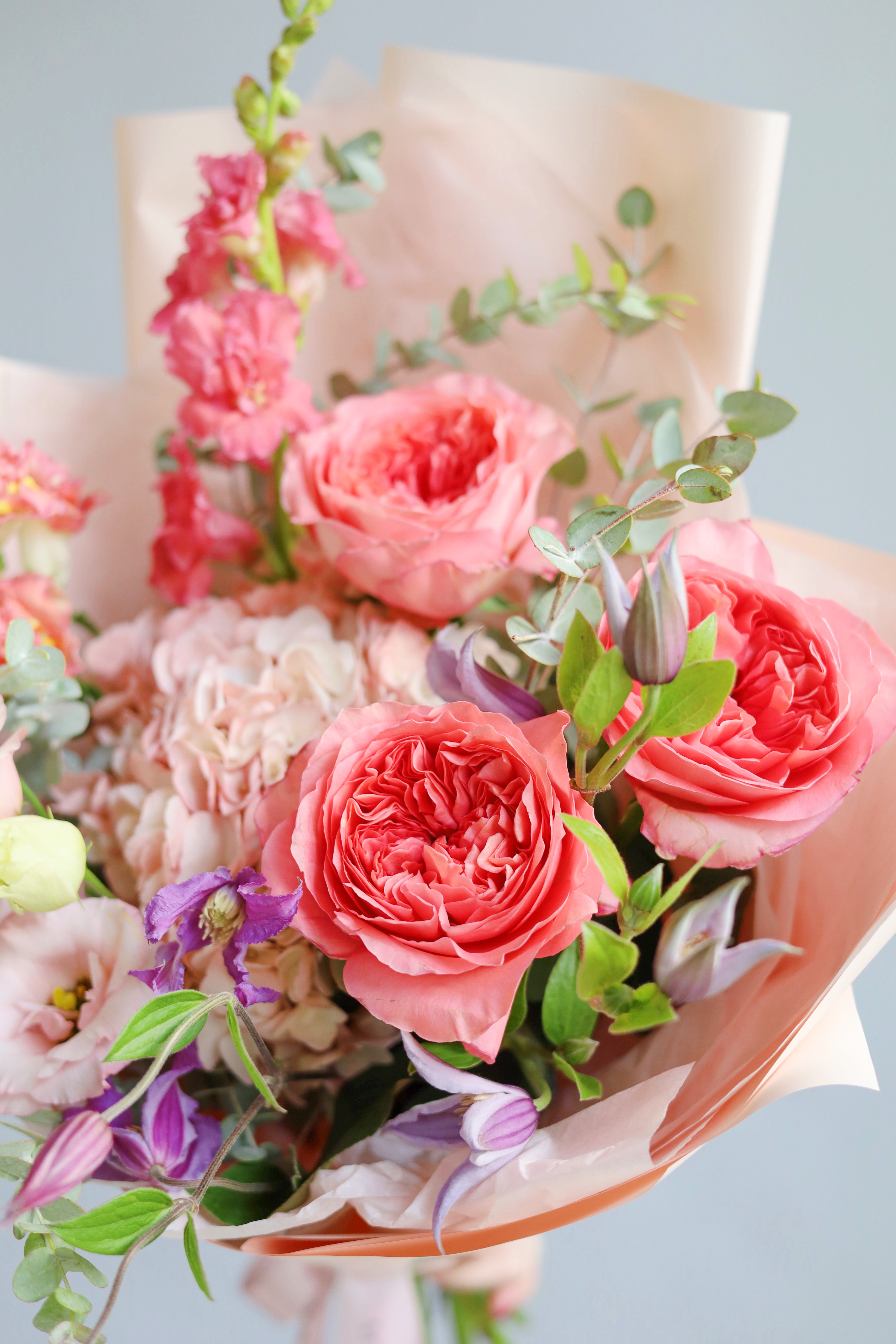 БУКЕТ С ГОРТЕНЗИЕЙ, КЛЕМАТИСОМ И ПИОНОВИДНОЙ РОЗОЙ